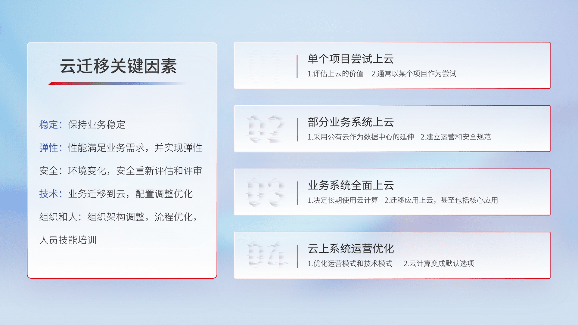 结合实际业务,,,从规划设计、、云平台选型、、云原生改造、、、、数据迁移、、、集成交付,,,,迁移全过程为客户识别最佳上云路径,,,做好风险识别管理,,设计网络架构、、身份权限、、、安全审计合规、、、操作审计、、、日志审计、、、、监控告警策略、、、多站点容灾设计等,,对云上基础设施进行整体规划,,提升IT治理水平,,,以满足弹性、、、、高可用、、、、高性能的需求。。